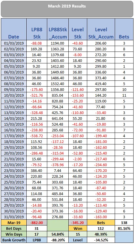Using $10.00 starting Stakes LP88 Staking = $1,557.88 ProfitLevel Staking = -$142.50 LossBets 1,330; Wins 1125 (84.58% Strike Rate)